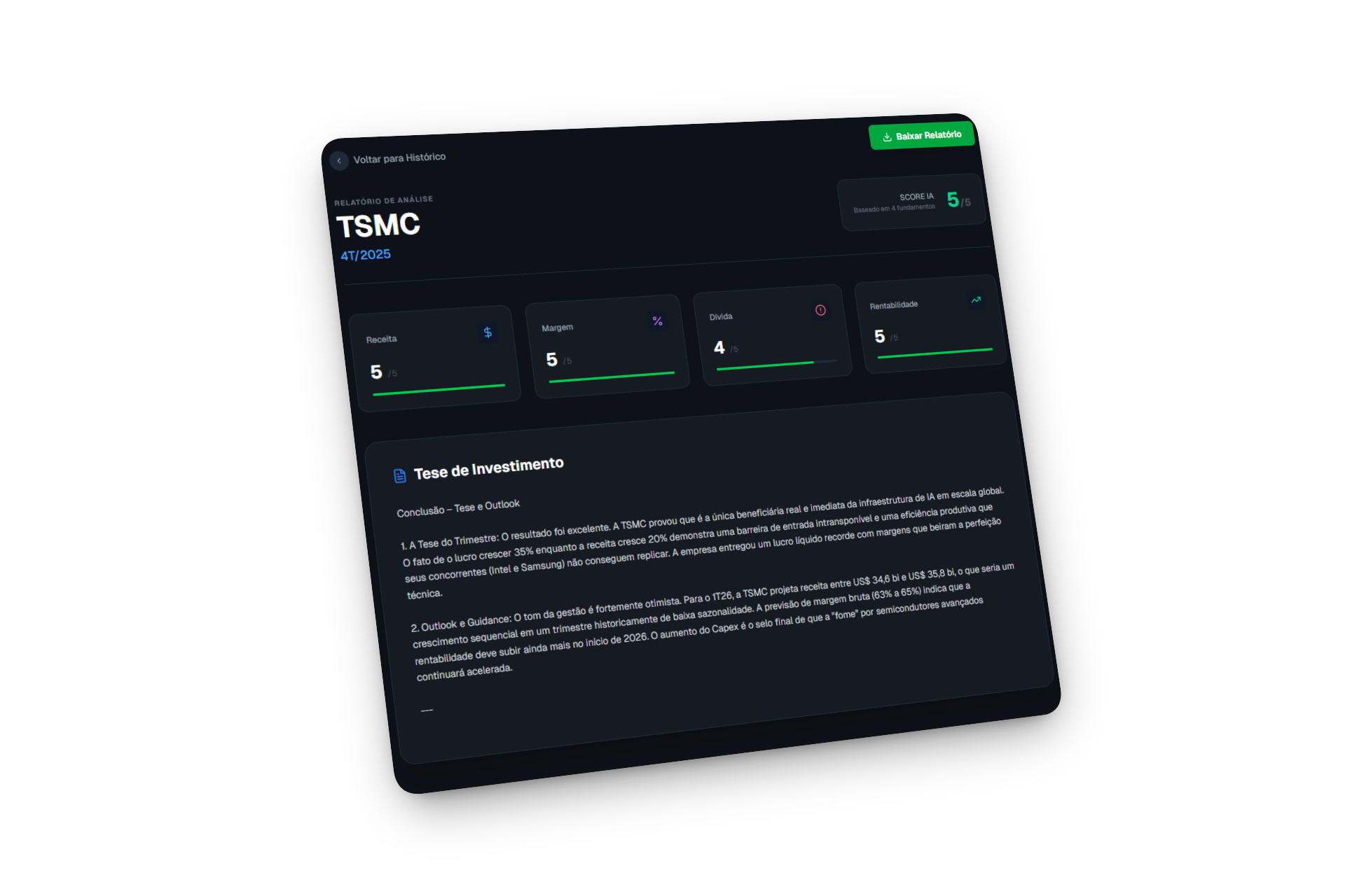 Abandone a leitura manual de PDFs. Nossa IA lê os balanços, interpreta os dados e entrega uma tese de investimento completa.