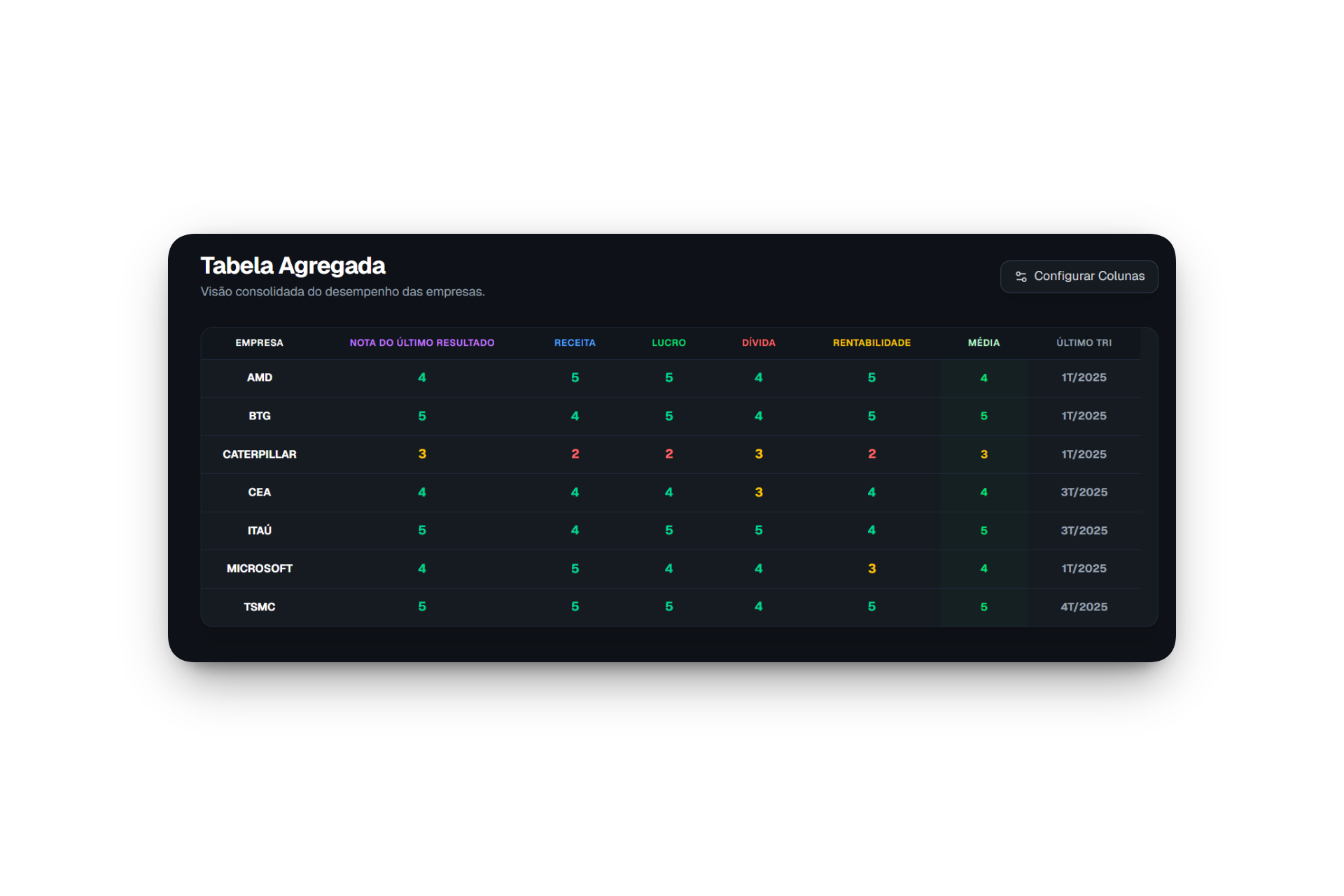 Visualize todas as empresas que você analisou em uma única tabela interativa. Ordene por Nota, Receita ou Lucro.