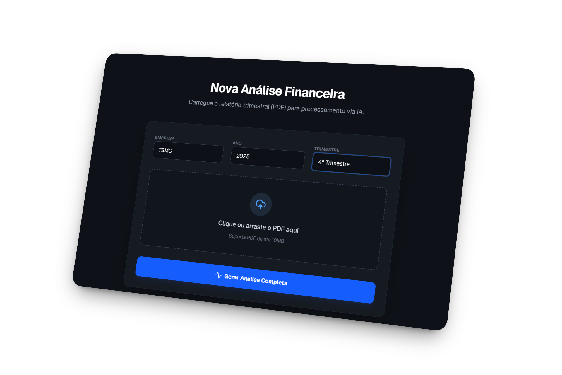 Esqueça configurações manuais. Basta arrastar o PDF do Release de Resultados (ITR ou DFP). Nossa IA identifica automaticamente a empresa, o trimestre e o ano.